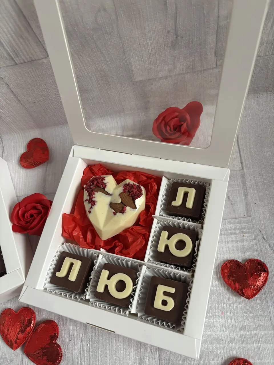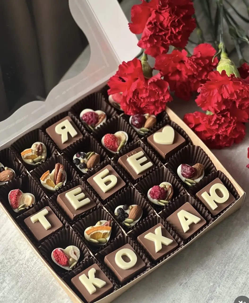 Молочний шоколад із літерами з білого шоколаду та серцями з горіхами, ягодами й насінням — кожна цукерка має свій смак і настрій 🎁