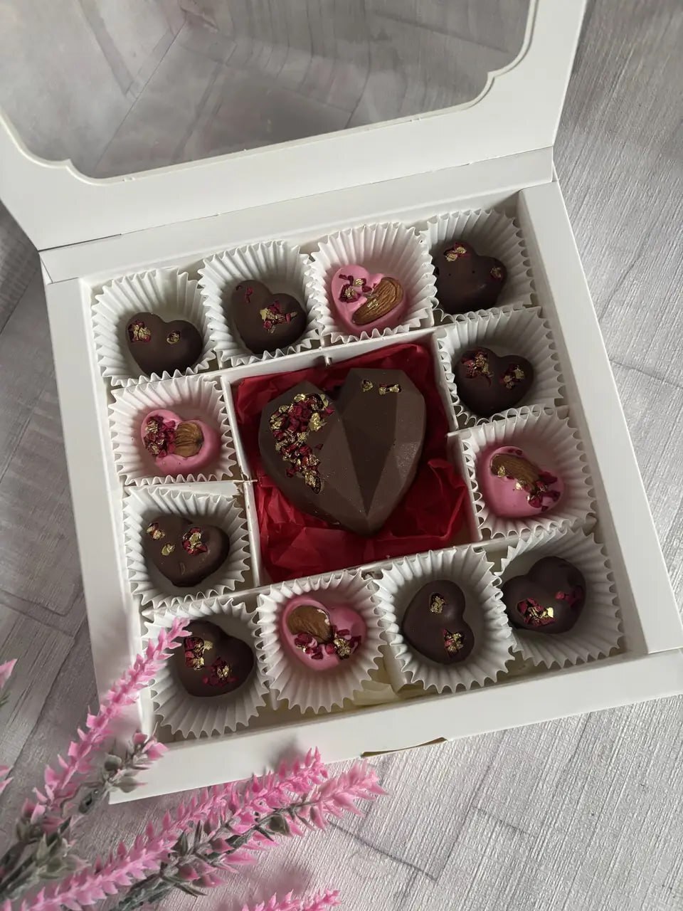 Набір шоколадних цукерок ручної роботи у формі сердець ❤️, оздоблених пелюстками та горіхами, з акцентною центральною фігурою — великим шоколадним серцем 💝