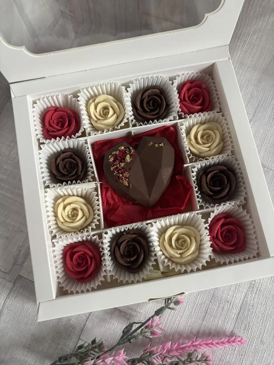 Набір шоколадних цукерок з фігурками у формі троянд 🌹 з різних видів шоколаду та акцентною фігурою — серцем або «Вісімкою» на вибір ❤️, прикрашеною їстівним золотом і пелюстками