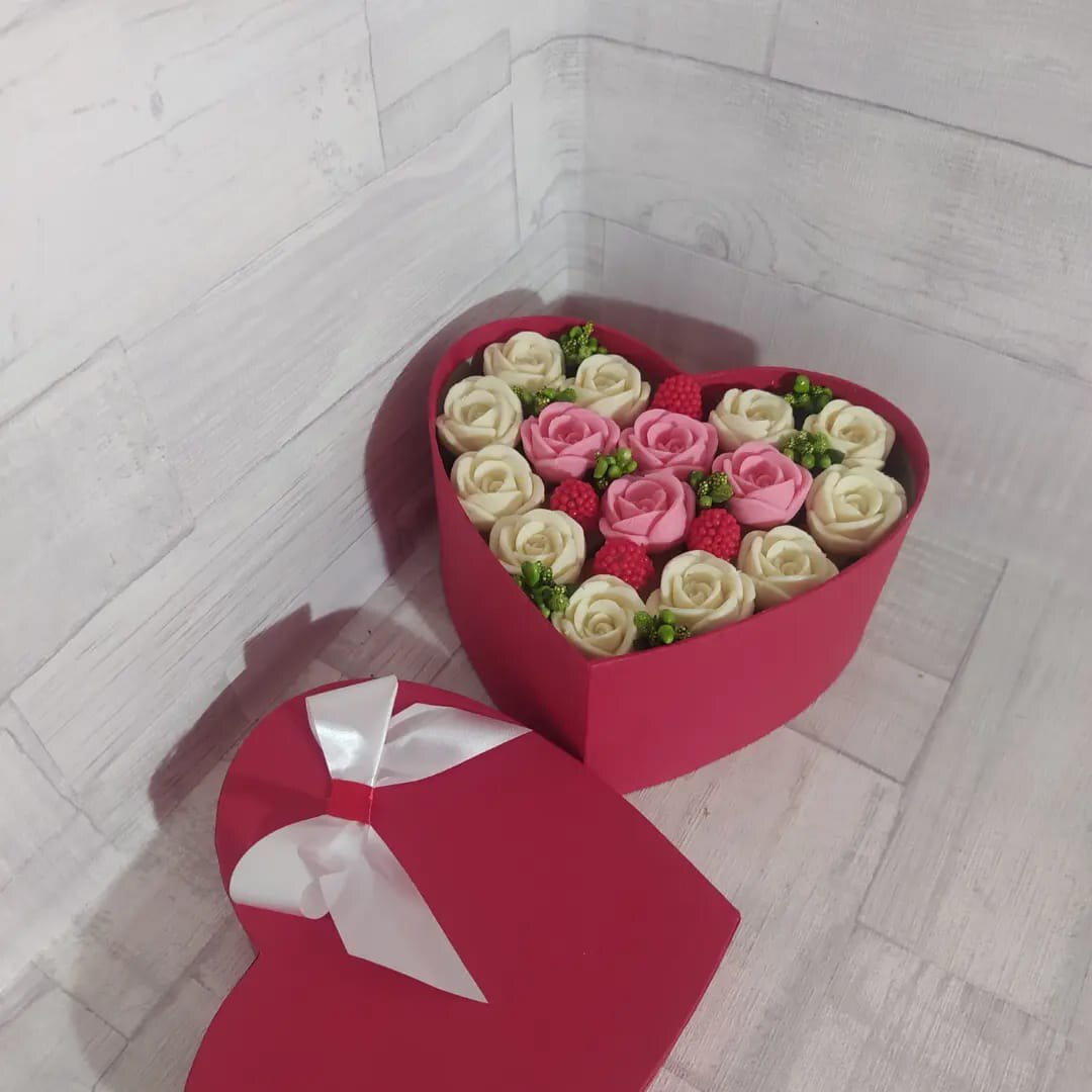 🍫 Елегантний набір у формі серця з авторськими шоколадними трояндами, ягодами та витонченим декором. Кремові та рожеві відтінки дарують тепло,любов і турботу 🎁