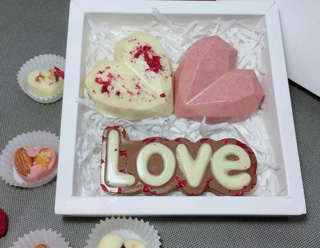 💝 Витончений шоколадний набір з написом «КОХАЮ» та фігурним серцем, оздоблений натуральними інгредієнтами й оформлений у стильну подарункову коробочку ❤️